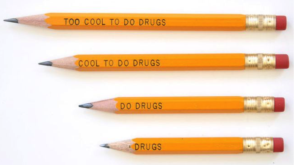 I also want you to think about the product’s life and how it looks as it gets used. The phrase “too cool to do drugs” sounds like a good idea to put on a pencil but presenting a phrase in the wrong direction can say the opposite of what you intended.