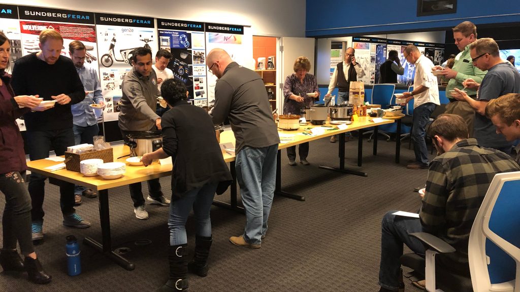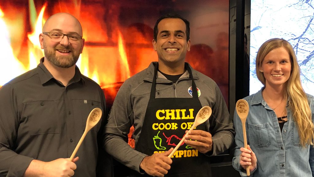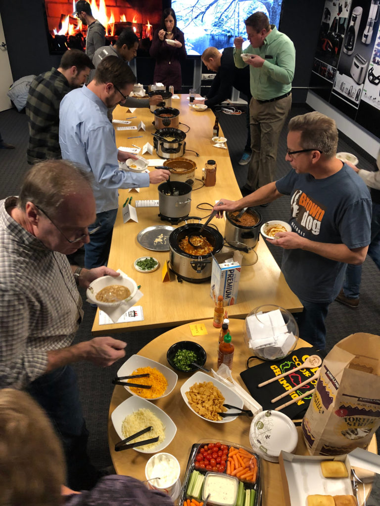 This year, there were a whopping seven chili entries! Those of us who didn’t bring chili instead opted to bring corn bread and all the “fixins”. Thanks to our wonderful office manager, Jessie Craig, and our VP/Principal + Director of Design, David Thimm, our main conference room was transformed into a cozy potluck atmosphere complete with a cheery winter scene and a crackling Yule log playing on the presentation screens.
