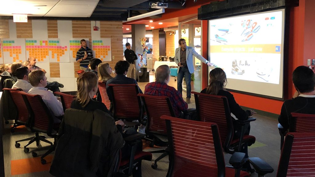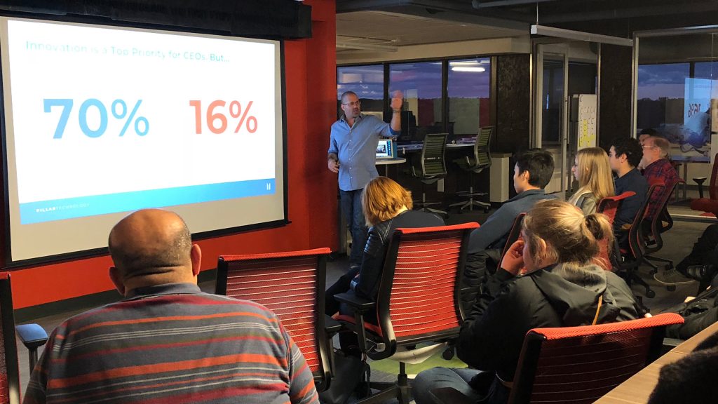 Jeff followed giving an overview of the creative process that drives innovation at Pillar Technology. They focus on delivering quality fast in the world of software design. To achieve this, they place an emphasis in their design process on accelerating the phases of defining the design problem and ideating on a solution in order to get to creating a prototype and testing it as quickly as possible. This way, more time is spent in testing the design and learning how to improve it which delivers a quality design faster.