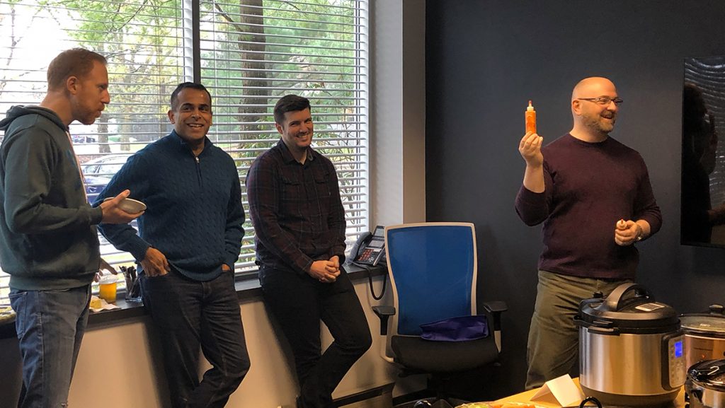 As we all chowed down on our chili, some of us were brave enough to try one drop of the least spicy sauce, while others of us, like Jeevak, our Director of Strategic Growth, and Tomer, our CFO, had no trouble enjoying 10-12 drops of the hottest sauce! Needless to say, the sauces were an absolute hit!