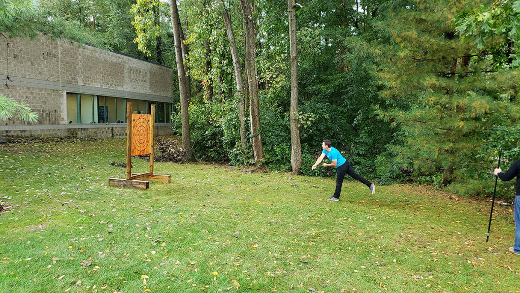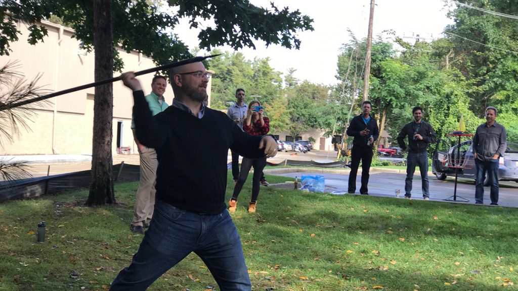 Drinks, pretzels, and other fall treats were passed out. Designers, engineers, model makers, and innovation strategists alike tried their hand at the fall sports. The sheer satisfaction of hitting the bull’s-eye encouraged us to try again and again, and stray beams of sunlight made the blades flash festively. Two or three of us even managed to make the javelin stick in the target! David, our Director of Design apparently had hidden skills of knife throwing and taught us the tricks to a good throw. Then, to our surprise, he even juggled three knives at once! As if one hidden talent wasn’t enough!