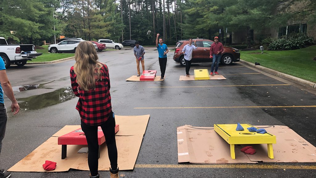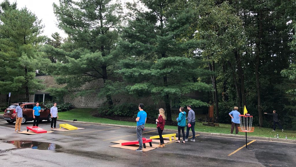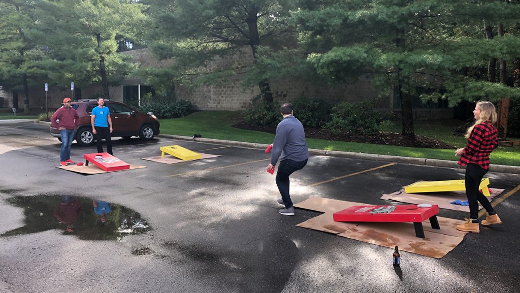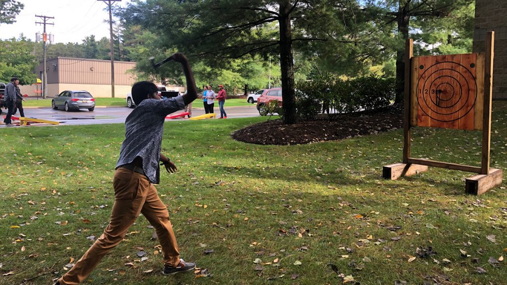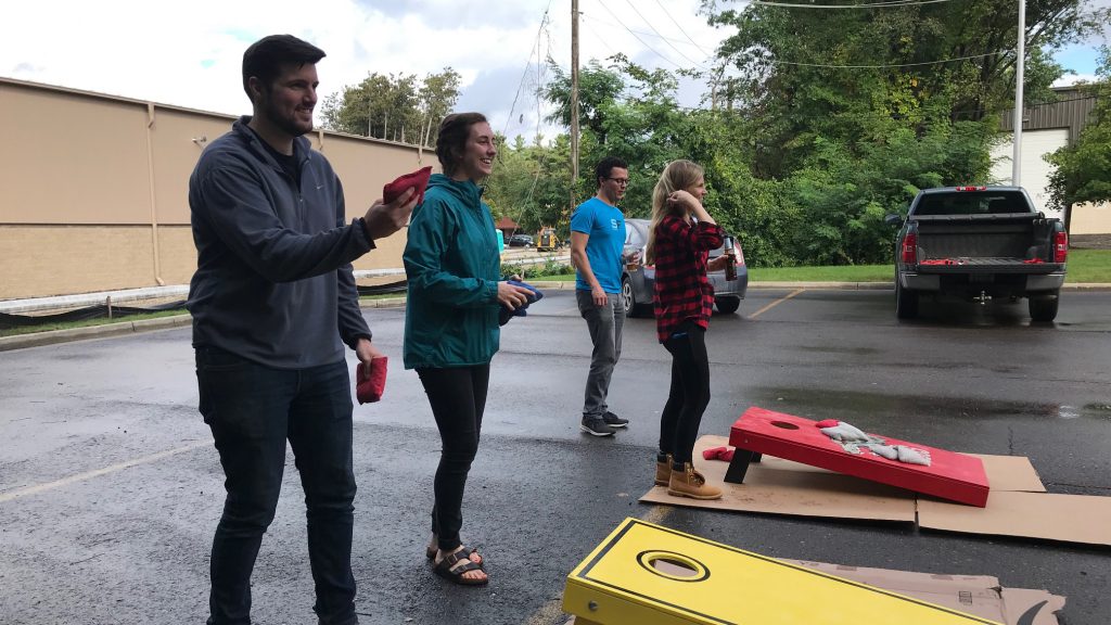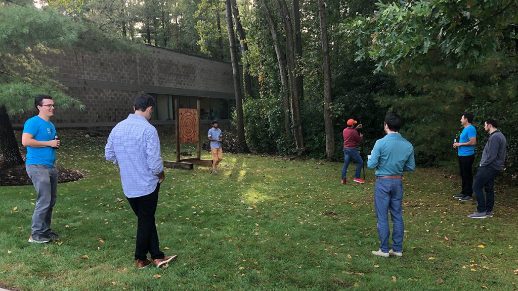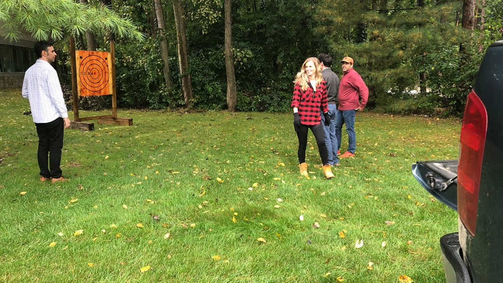 As we congregated outside, Jessie, our Office Manager by day, and a seasoned hunter and woods-woman by night, backed her pickup to the lawn. The others then helped her hoist her huge, homemade axe throwing target, along with her axes, onto the grass. Jeevak, our Director of Strategic Growth brought his throwing knives and a javelin to share and add to the festive sports. Of course he just had these things lying around at home from his own weekend passion of Obstacle Course Running! Grey, our CEO and Director of Engineering also brought out the corn hole set that he handmade with his woodworking skills, and soon, an epic tournament took shape!